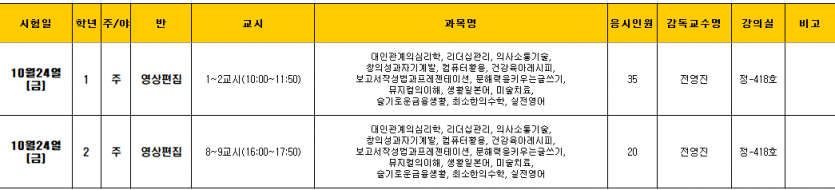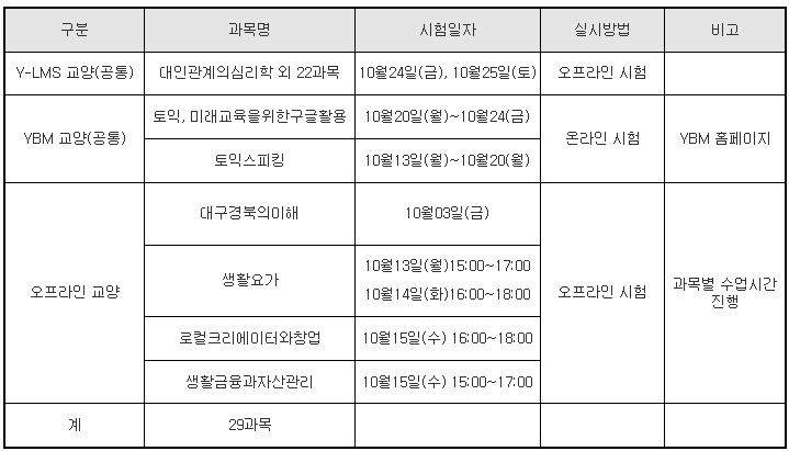 25학년도 2학기 중간고사 교양 시험 시간표 안내