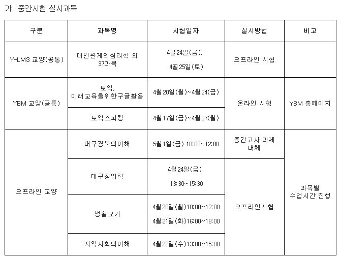 ※ YBM, 오프라인 교양은 붙임2. 중간시험 실시과목 표를 참고하여 시험기간에 혼동 없으시길 바랍니다.